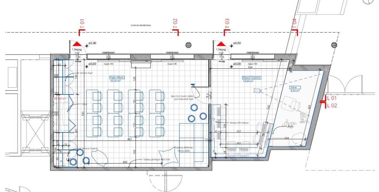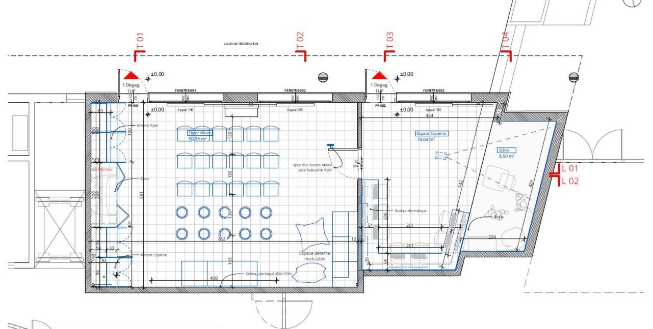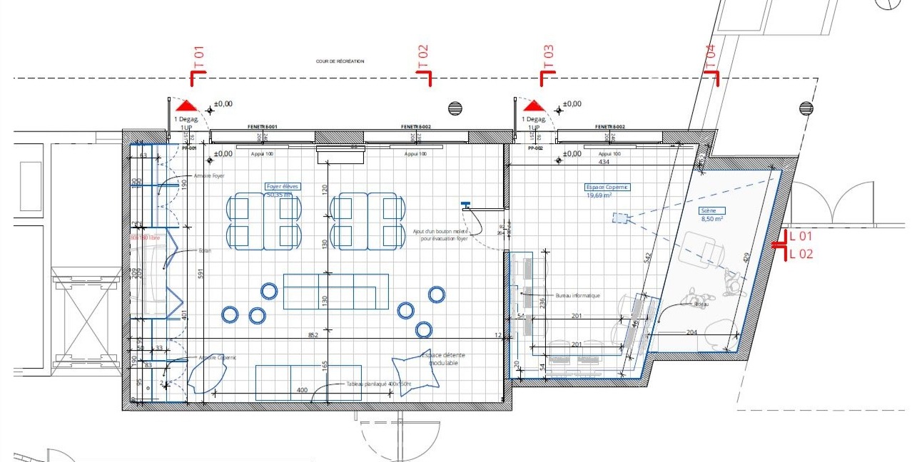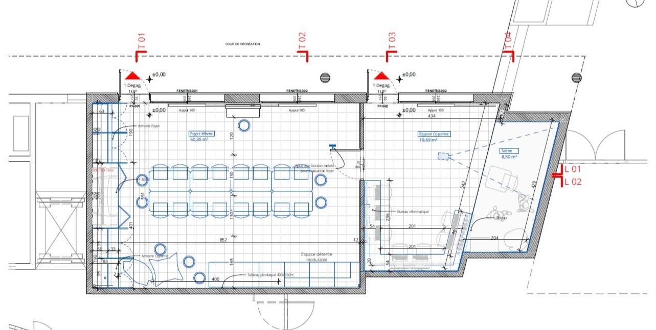 Cet espace conserve sa volumétrie et sa matérialité existante. Dans un soucis écologique et économique, il nous semblait indispensable de préserver au maximum les ressources existantes sur place. Nous sommes intervenu sur l’agencement et le mobilier, proposant de nouveaux espaces modulaires, accueillants et confortables. Plusieurs configurations peuvent animer l’espace en conférence, en classe entière, en demi classe et en foyer des élèves. Chacun sera ici mis à son aise et devra se sentir écouté et libéré du cadre scolaire permettant une nouvelle approche des mathématique moins formelle.