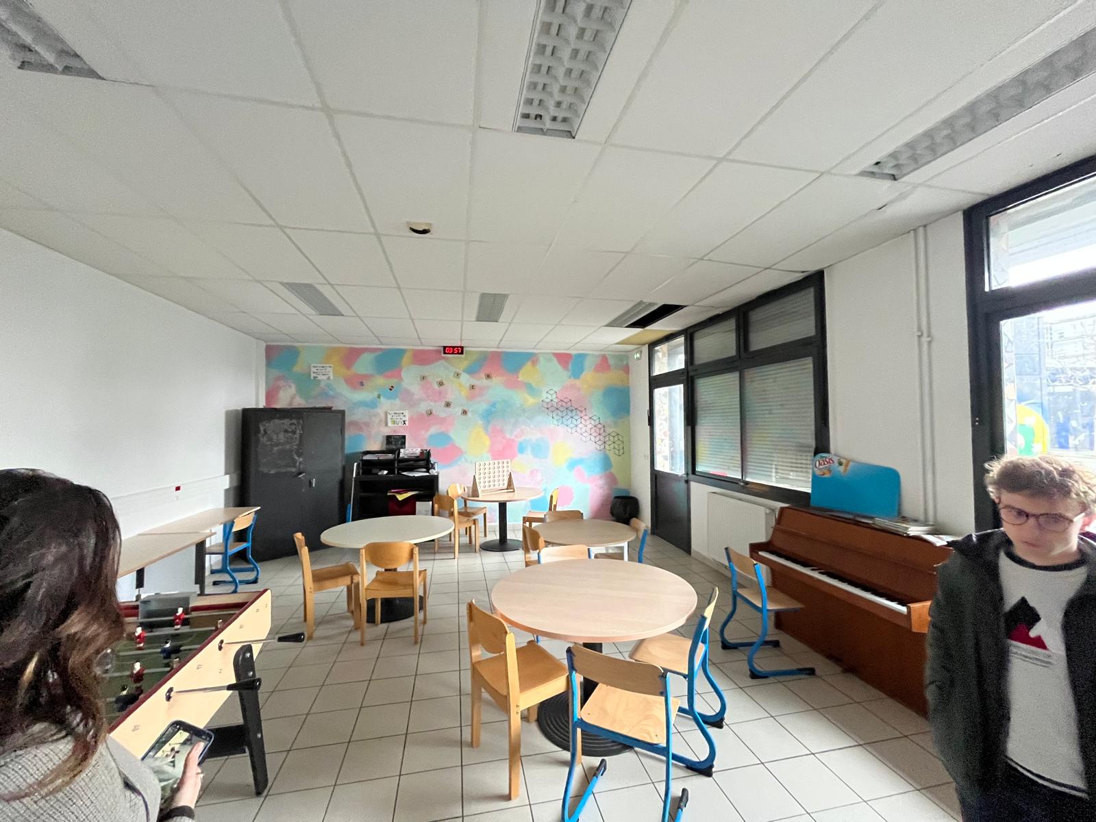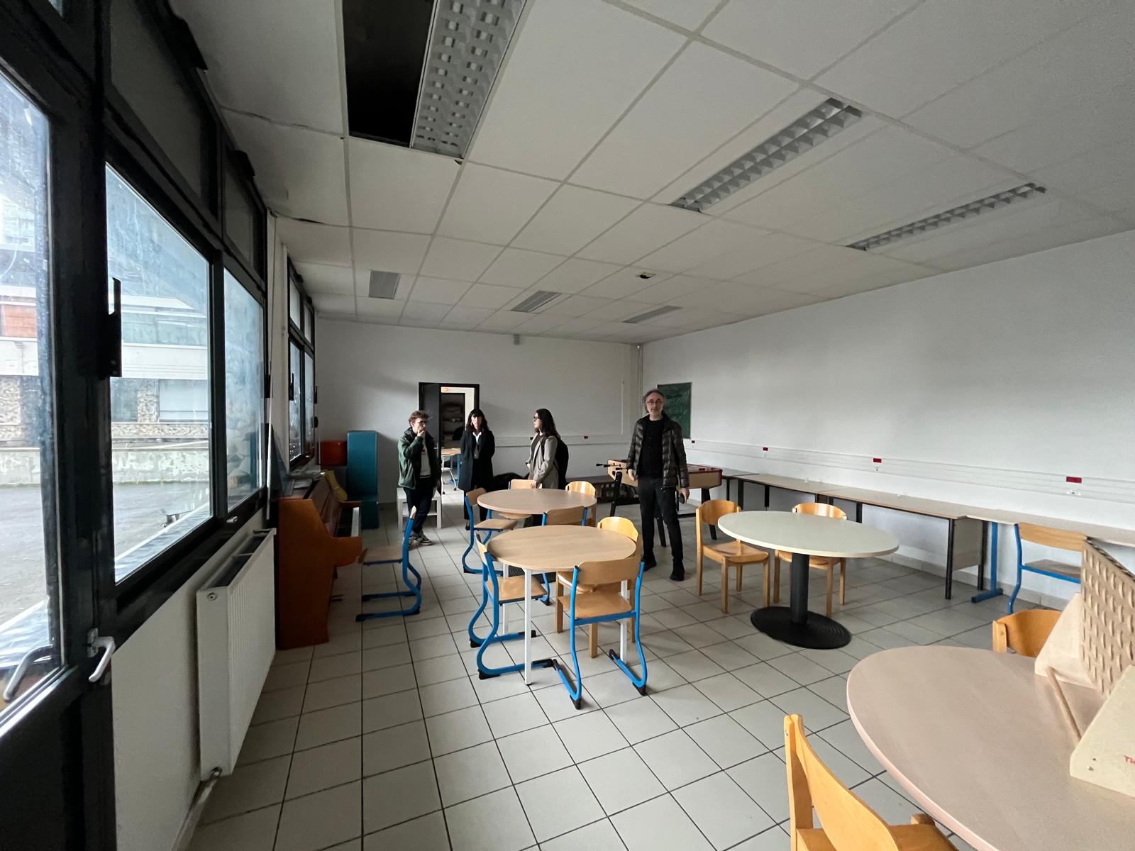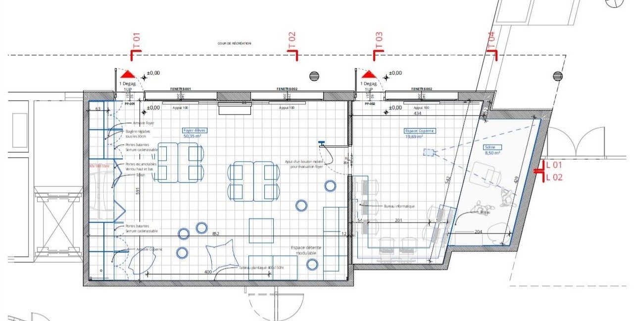 Cet espace conserve sa volumétrie et sa matérialité existante. Dans un soucis écologique et économique, il nous semblait indispensable de préserver au maximum les ressources existantes sur place. Nous sommes intervenu sur l’agencement et le mobilier, proposant de nouveaux espaces modulaires, accueillants et confortables. Plusieurs configurations peuvent animer l’espace en conférence, en classe entière, en demi classe et en foyer des élèves. Chacun sera ici mis à son aise et devra se sentir écouté et libéré du cadre scolaire permettant une nouvelle approche des mathématique moins formelle.